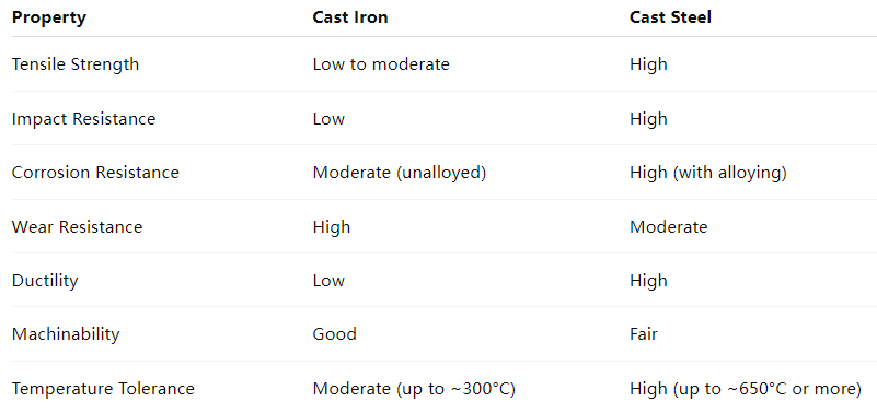 কাস্ট আয়রন, এর গ্রাফাইট সামগ্রীর কারণে, এর চমৎকার সংকোচন শক্তি এবং ভাল মেশিনিবিলিটি রয়েছে, তবে এটি ভঙ্গুর এবং প্রসার্য চাপ বা প্রভাবে ফাটল হওয়ার ঝুঁকিপূর্ণ। এর কম্পন স্যাঁতসেঁতে ক্ষমতা, তবে, উচ্চতর, যা নির্দিষ্ট স্ট্যাটিক অ্যাপ্লিকেশনগুলিতে উপকারী।