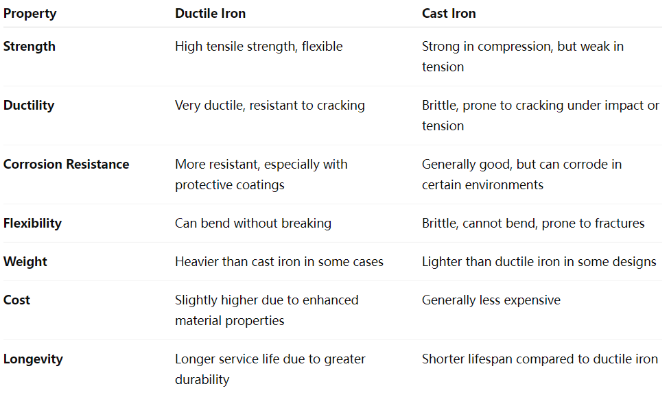 শক্তি: ঢালাই আয়রনের তুলনায় নমনীয় লোহার উচ্চতর প্রসার্য শক্তি এবং প্রভাব প্রতিরোধ ক্ষমতা রয়েছে, এটি চ্যালেঞ্জিং পরিবেশে আরও টেকসই করে তোলে।